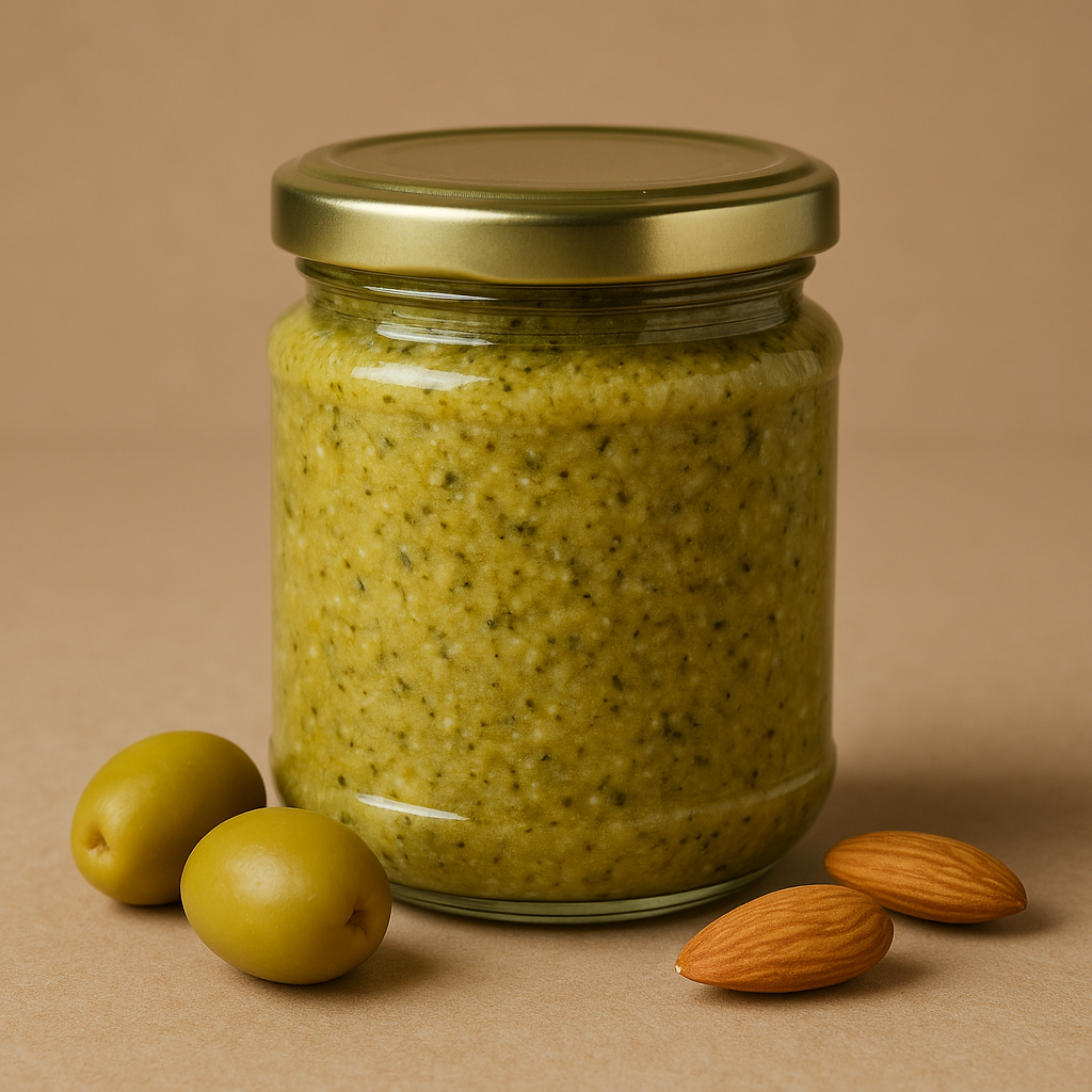 Paté de aceituna verde combinado con almendras, ideal para ensaladas, tostas y pastas.