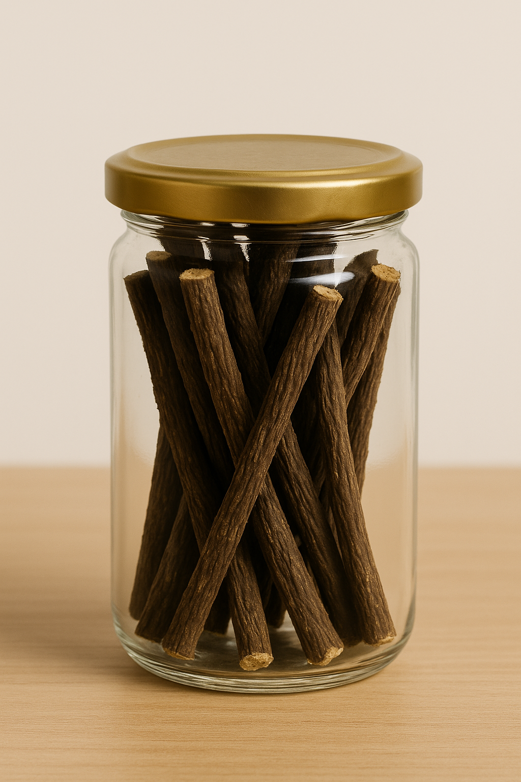 Regaliz en palo, con un sabor distintivo, ideal para endulzar de manera natural y saludable.